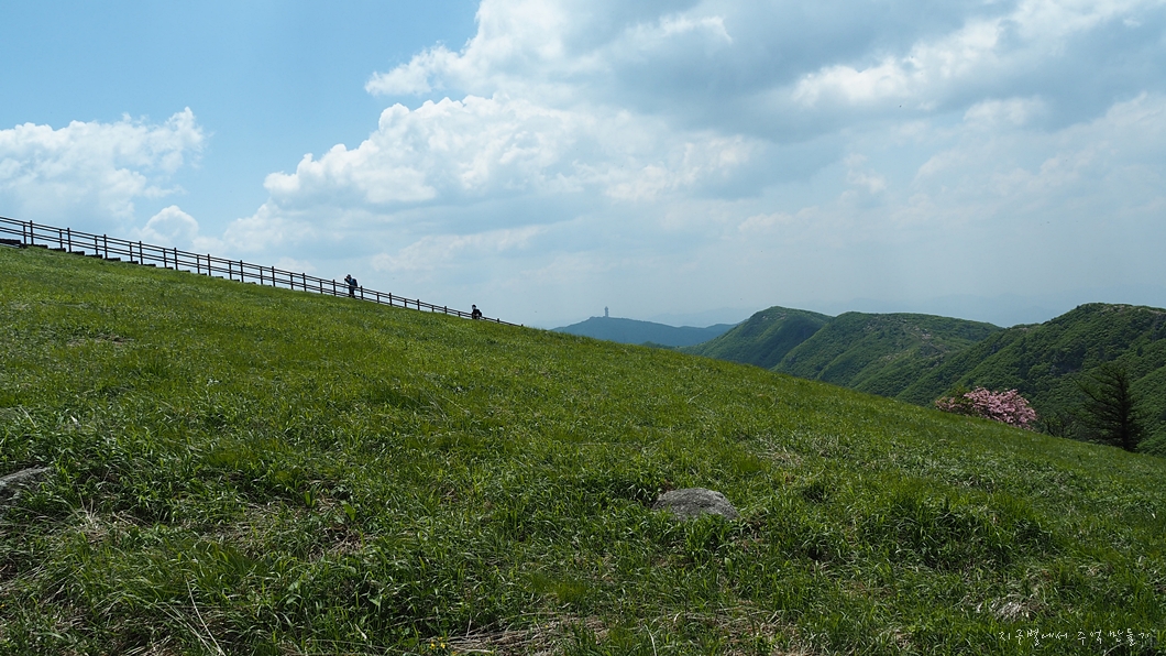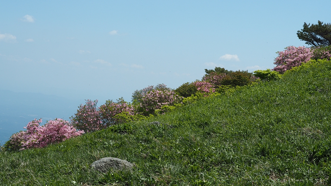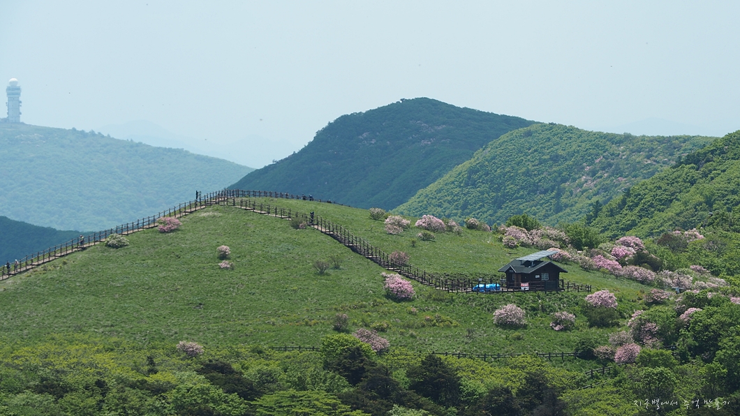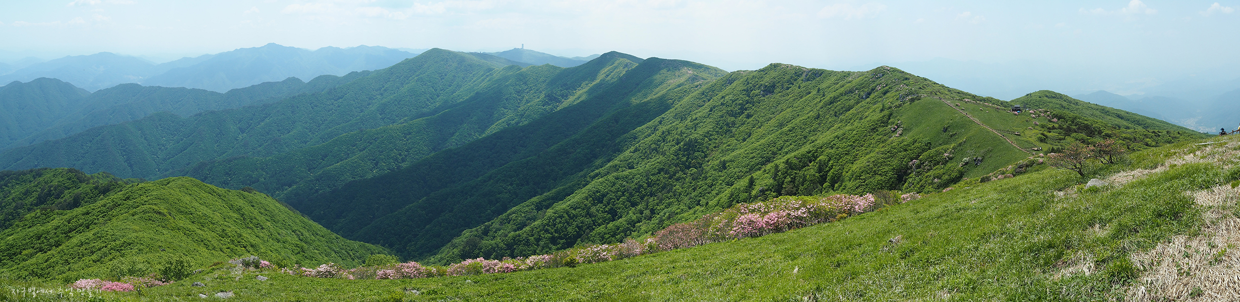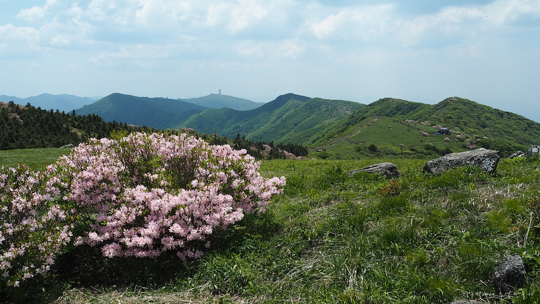 능선 중간에 있는 철쭉 꽃밭.