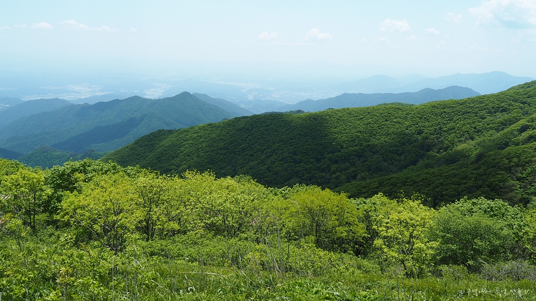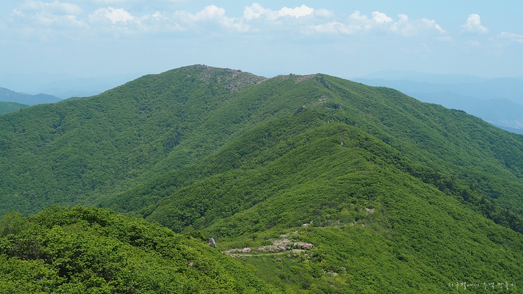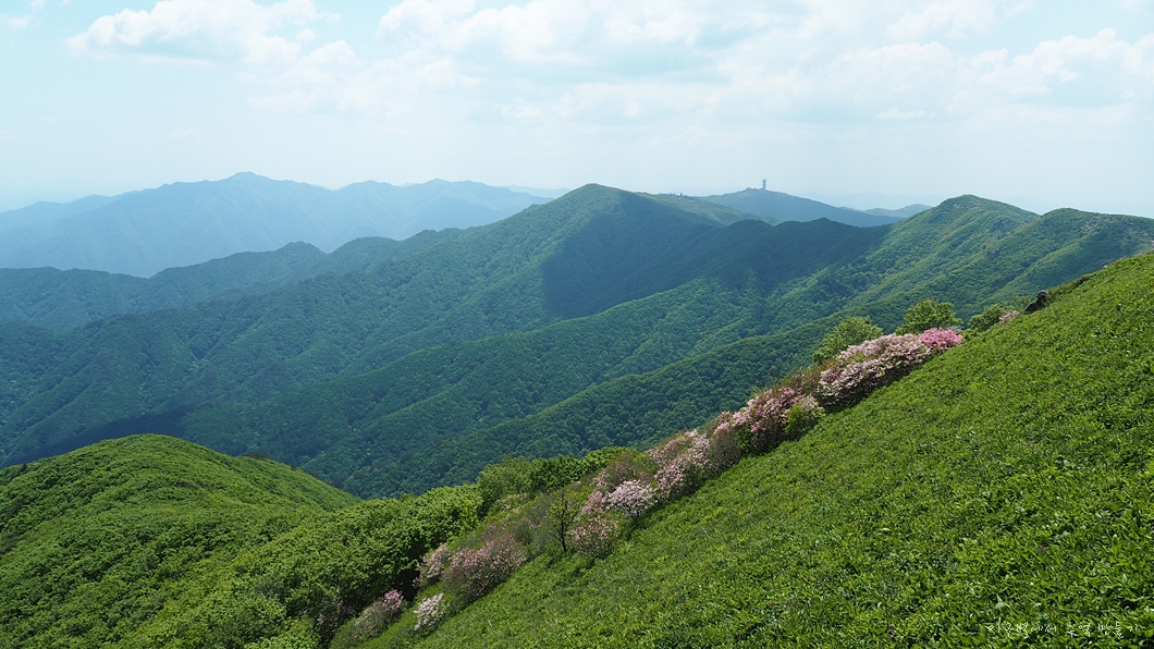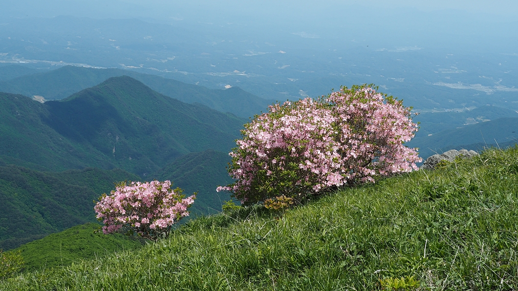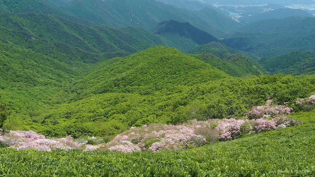 소백산 능선에 핀 연분홍 철쭉은 초록빛 배경에 더욱 돋보이는 아름다운 풍경입니다.
