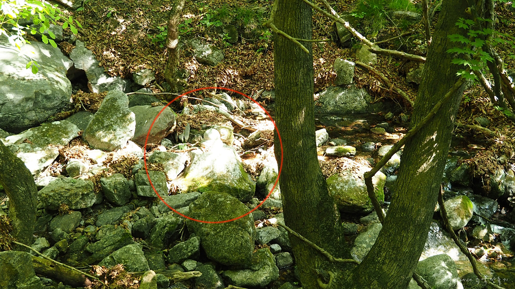 개울 속에 처박혀있는 석탑 상륜부..