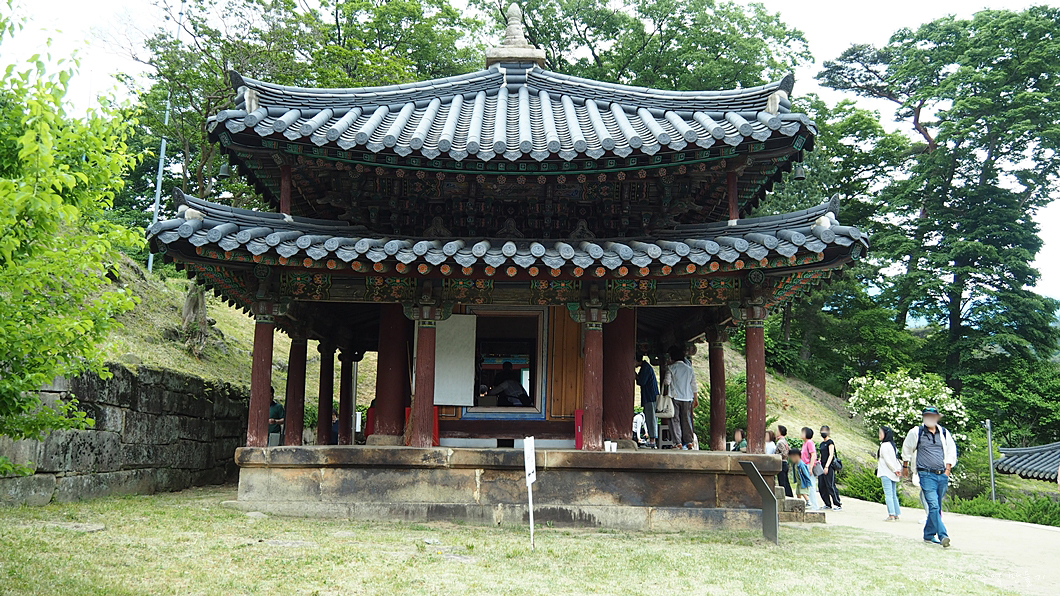 정사각 사모지붕의 한 칸짜리로 되어 있는데 목탑형식입니다.