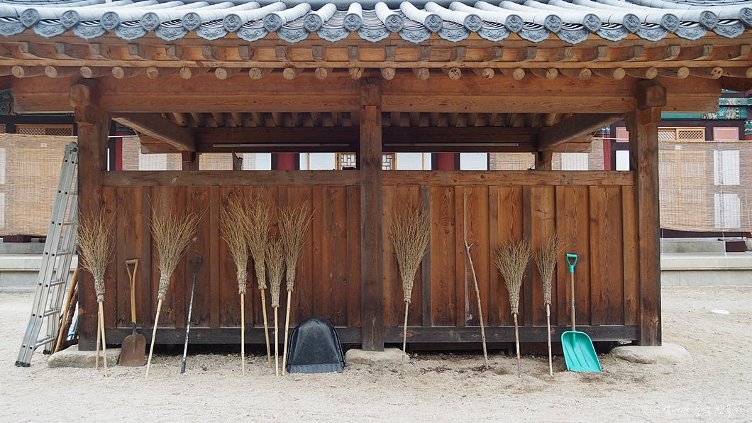 가지런히 놓여져 있는 스님들의 청소 도구.