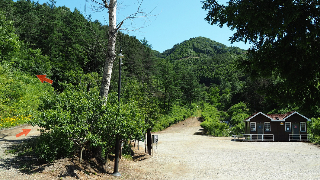 앞에 보이는 건물이 화장실이고 좌측 임도 따라 화살표 방향으로 10여 m 가다가 왼편으로 꺾여서 산길 쪽으로 오르면 됩니다.