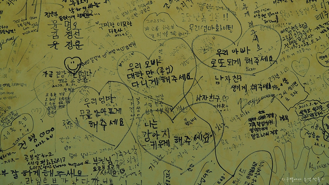 사리탑 앞 보궁 본전 뒷벽은 낙서장이 되어 있는데 각종 소원들이 적혀 있습니다.