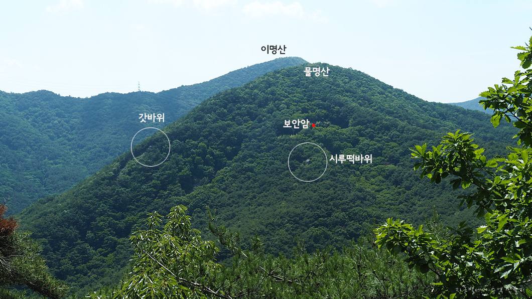 건너편으로 일찍 지나간 물명산 아래 시루떡바위와 갓바위가 건너 보이네요.