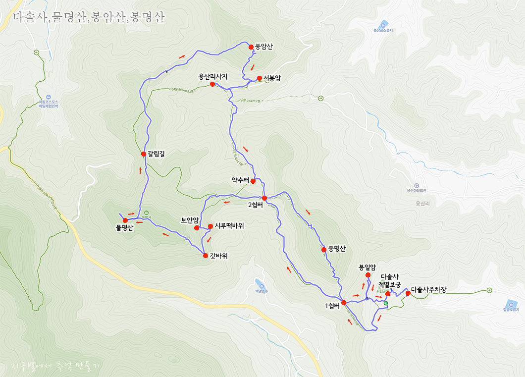 산행 코스 : 다솔사 주차장 - 보안암 - 시루떡바위 - 갓바위 - 물명산 - 봉암산 - 서봉암 - 약수터 - 봉명산 - 봉일암 - 다솔사(원점회귀)