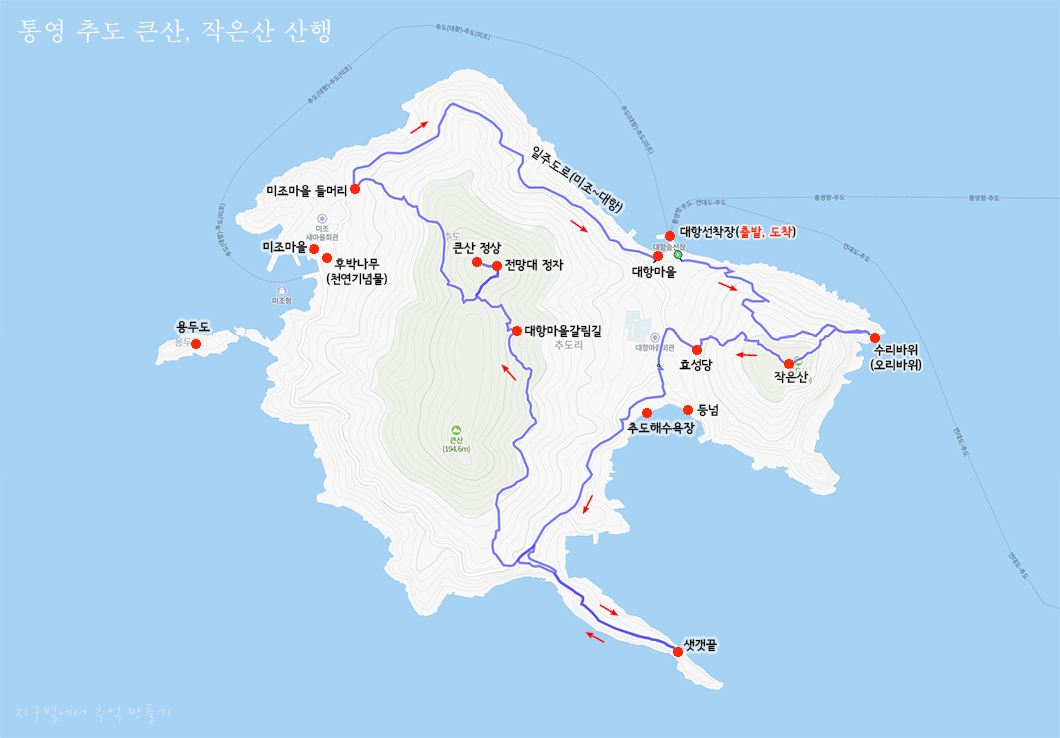 산행 코스 : 대항마을 - 수리바위(오리바위) - 작은산 - 추도해수욕장 - 샛개끝 - 큰산 - 미조마을 - 대항마을(원점회귀)