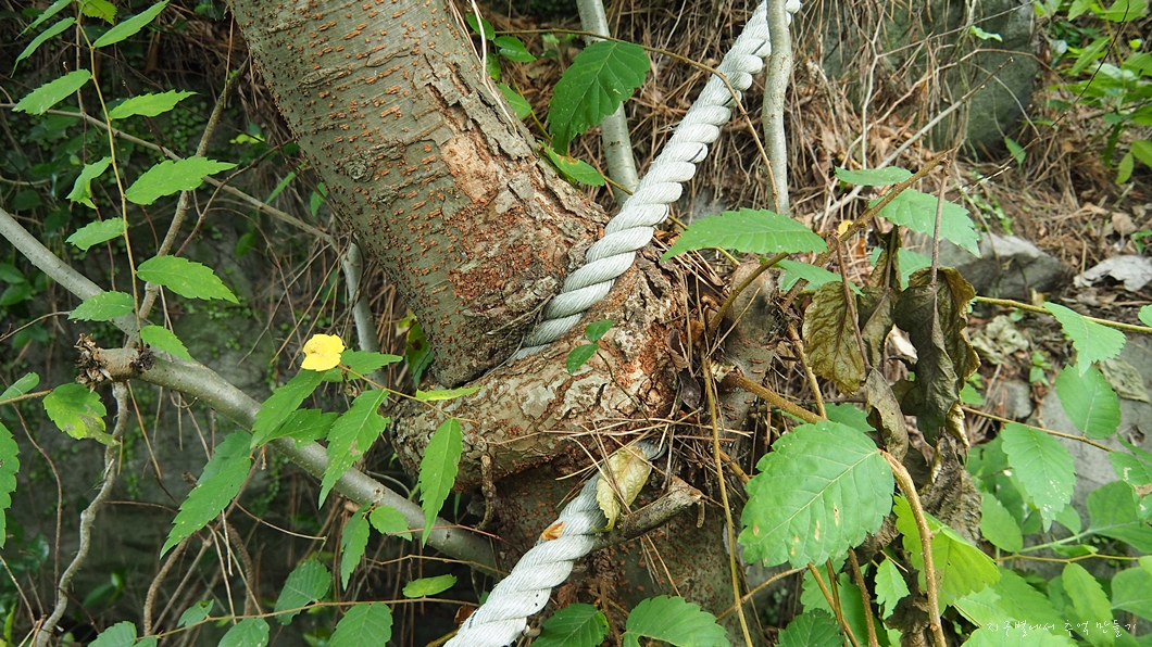 매여놓은 안전로프가 굵어지고 있는 나무속으로 파고 들어갔네요.