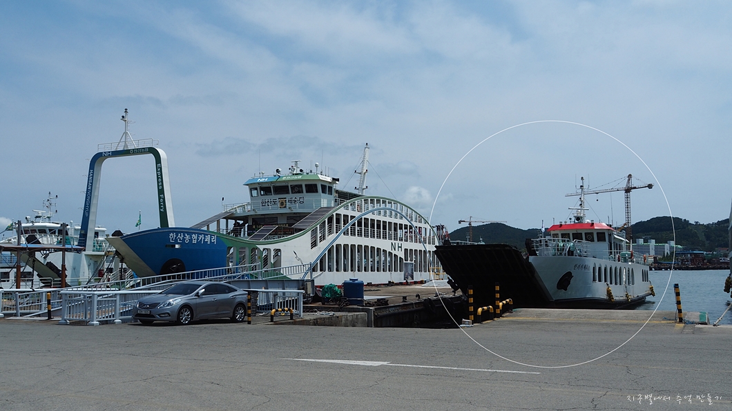통영항 여객선터미널에서 하루 두 번 운행하는 한려카페리호 오후 2시 30분발에 차를 싣고 추도로 출발.