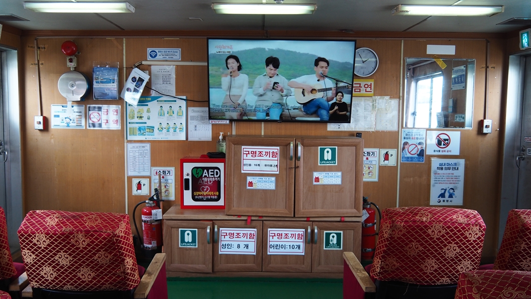 배를 타면 객실에 들어가서 도착할 때까지 잠을 자거나 TV를 보거나 또는 이야기를 나누거나..