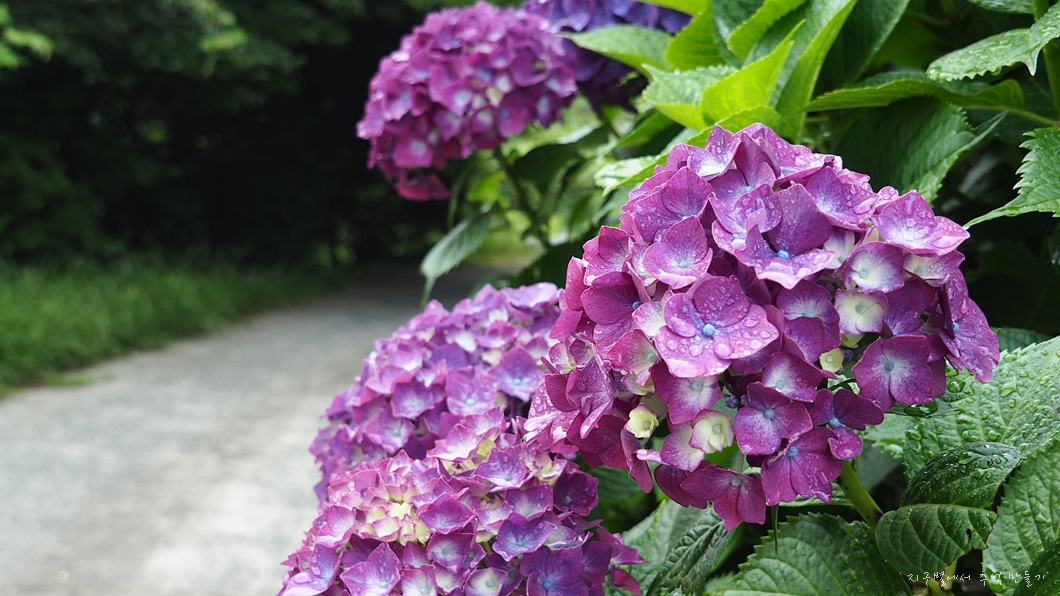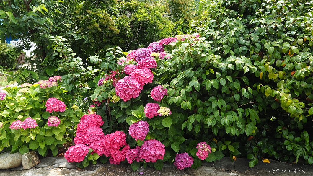 중간에 수국이 예쁘게 피었네요.