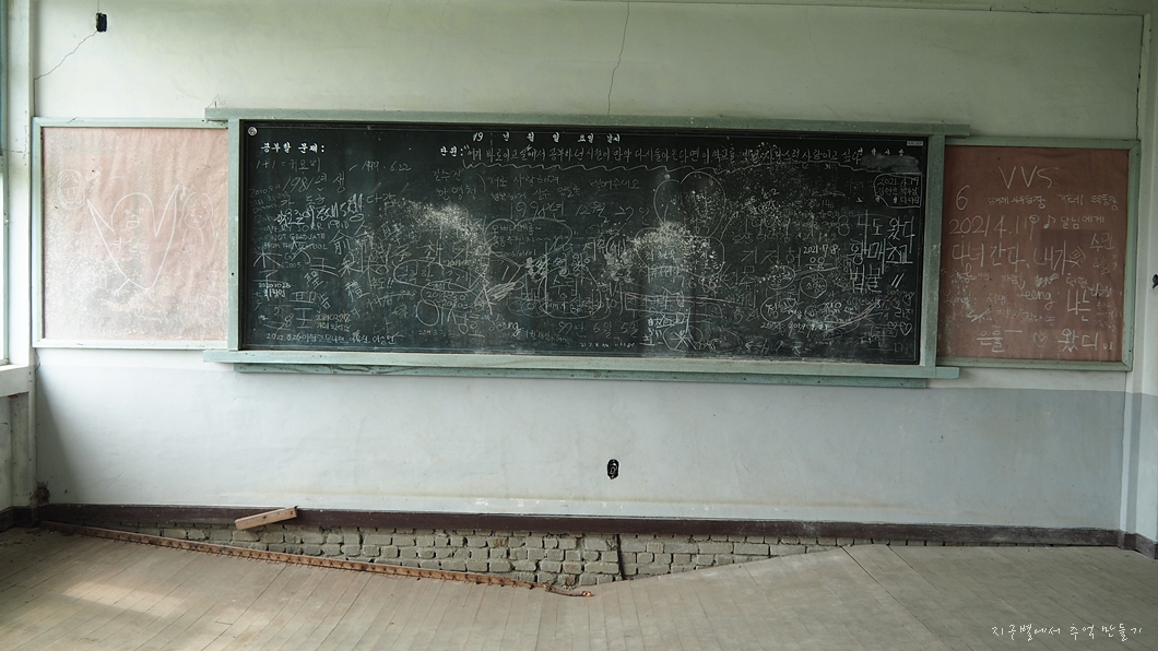 칠판에는 이곳 찾은 동문들의 안타까움과 회한, 그리고 섬을 방문한 이들의 소감이 같이 그려져 있네요.