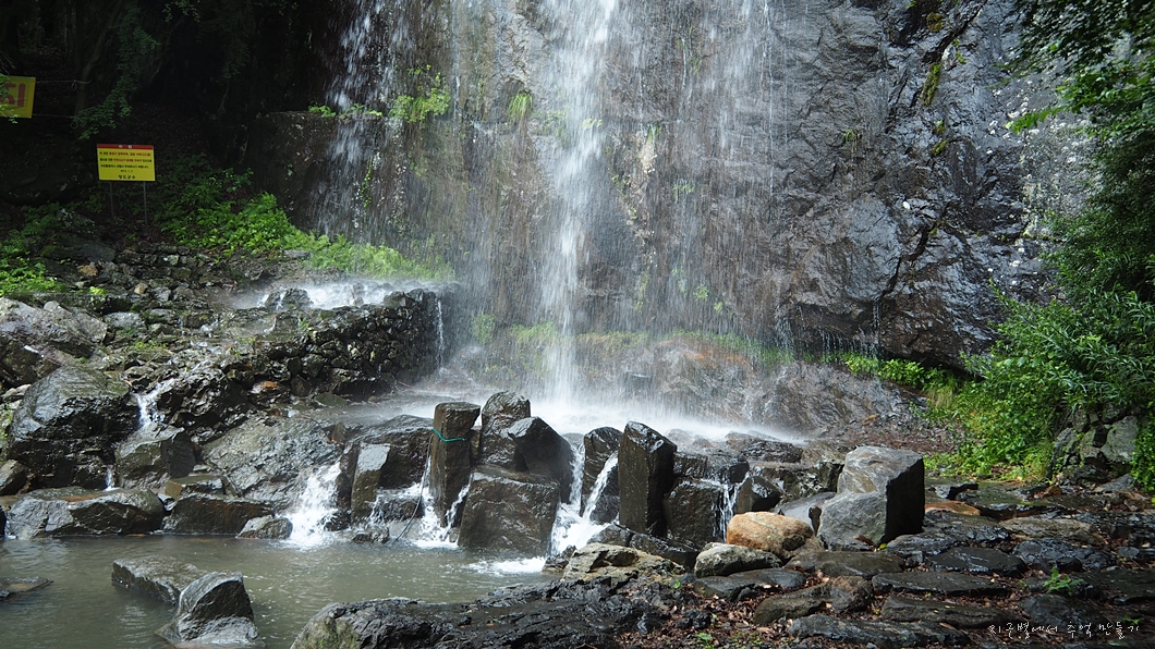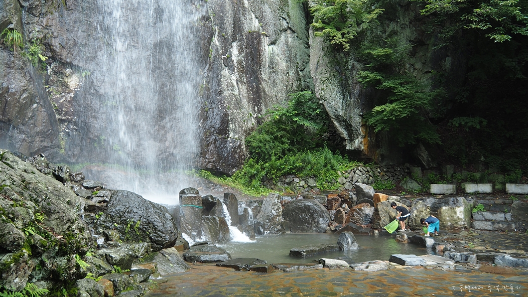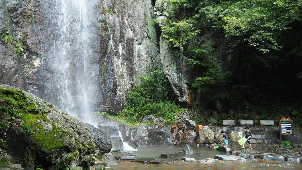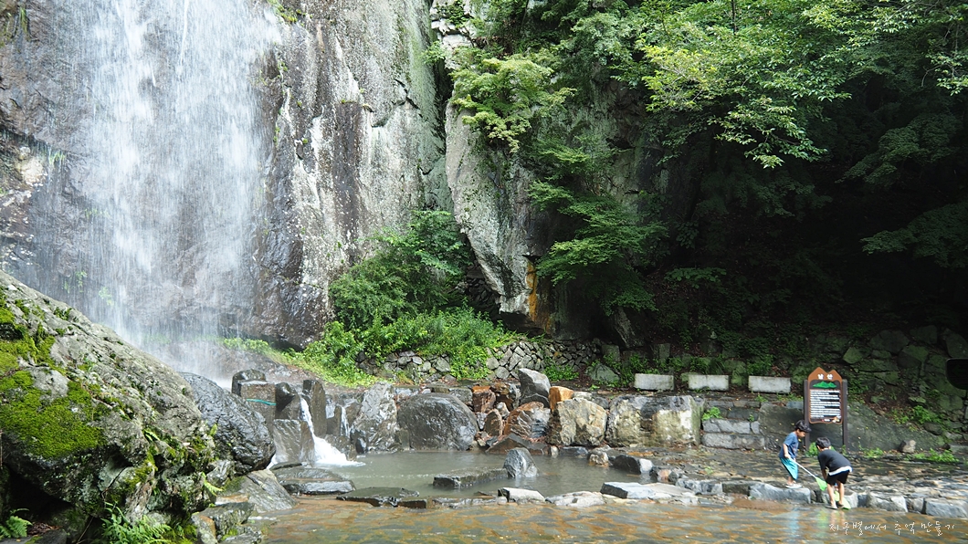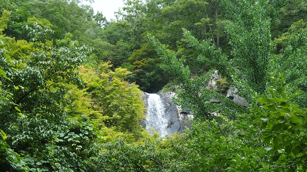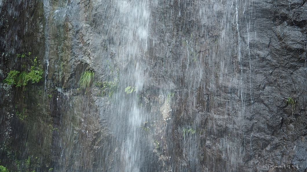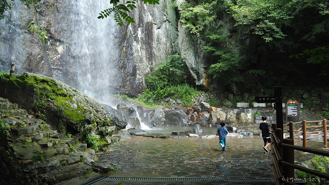 어느 폭포든 마찬가지로 비가 내리지 않으면 별 볼일 없지만 요즘 같은 장마철에는 귀청이 따가울 정도로 우렁차게 흘러 내리지유.