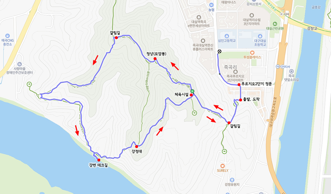 산행 코스 : 죽곡푸르지오 2단지 정문 쪽 등산로 입구 - 모암봉 정상 - 낙동강 데크길 - 강정대 - 등산로 입구(원점회귀)