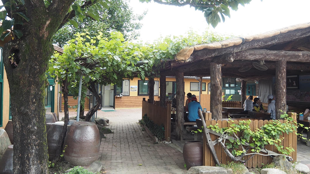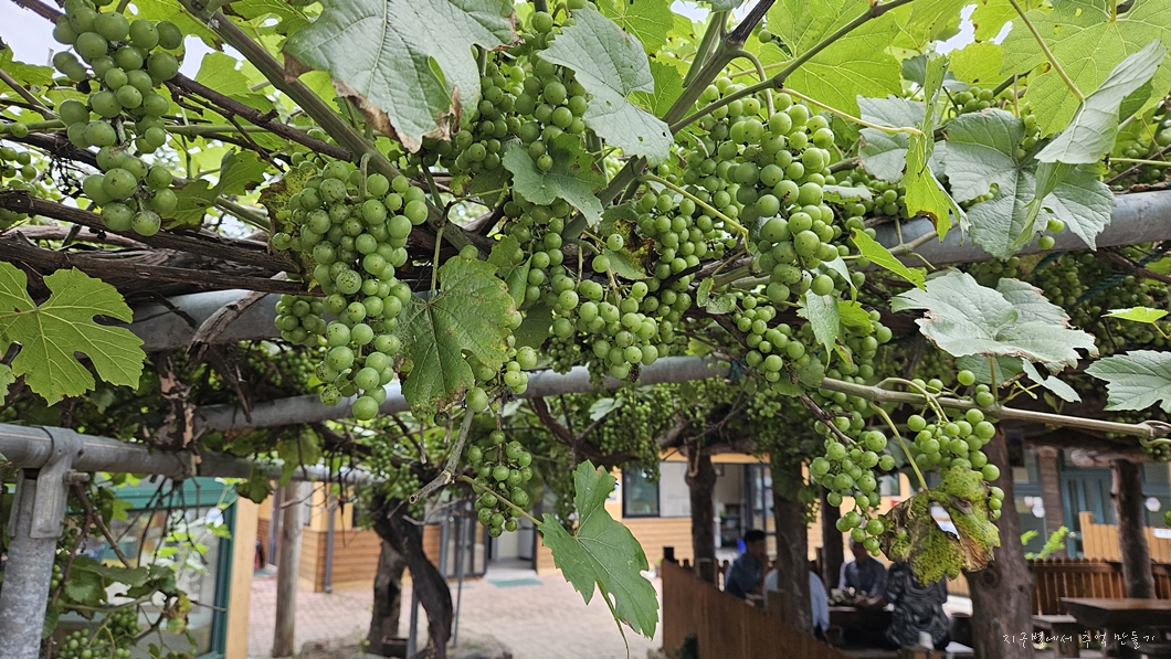 바깥에도 탁자가 많이 설치되어 있는데 머루가 주렁주렁 달려 있네요.