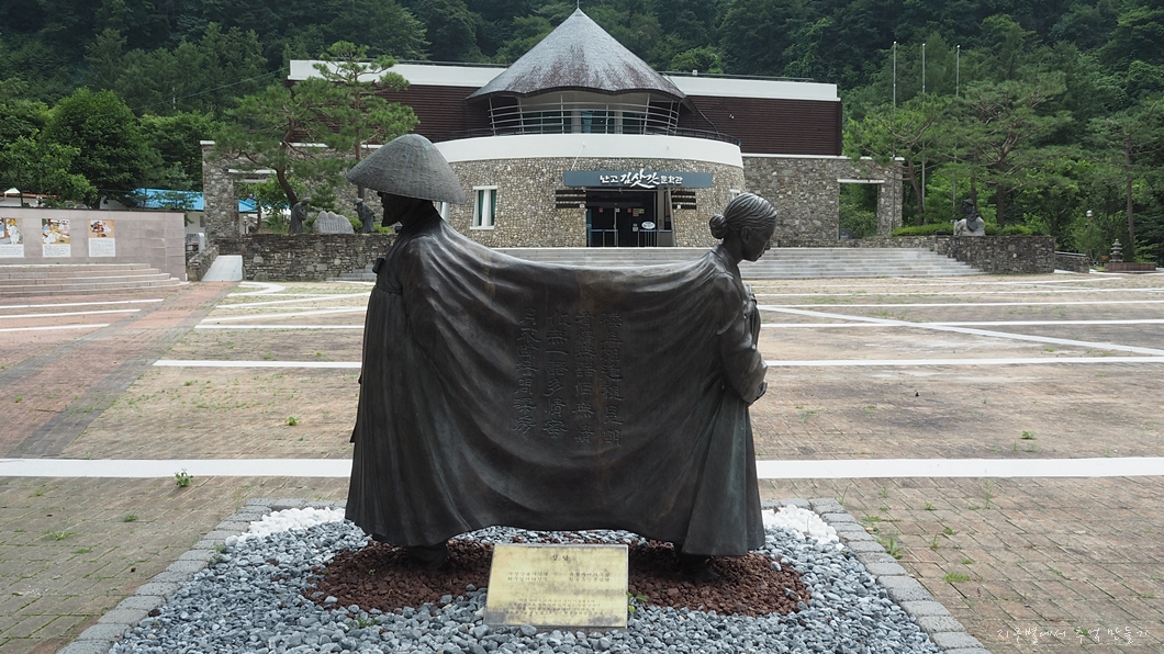 문학관 마당 주차장 한켠에는 김삿갓과 어느 여성이 한 이불(?)을 걸치고 있는 듯한 형상인데 가운데 시가 적혀 있습니다.