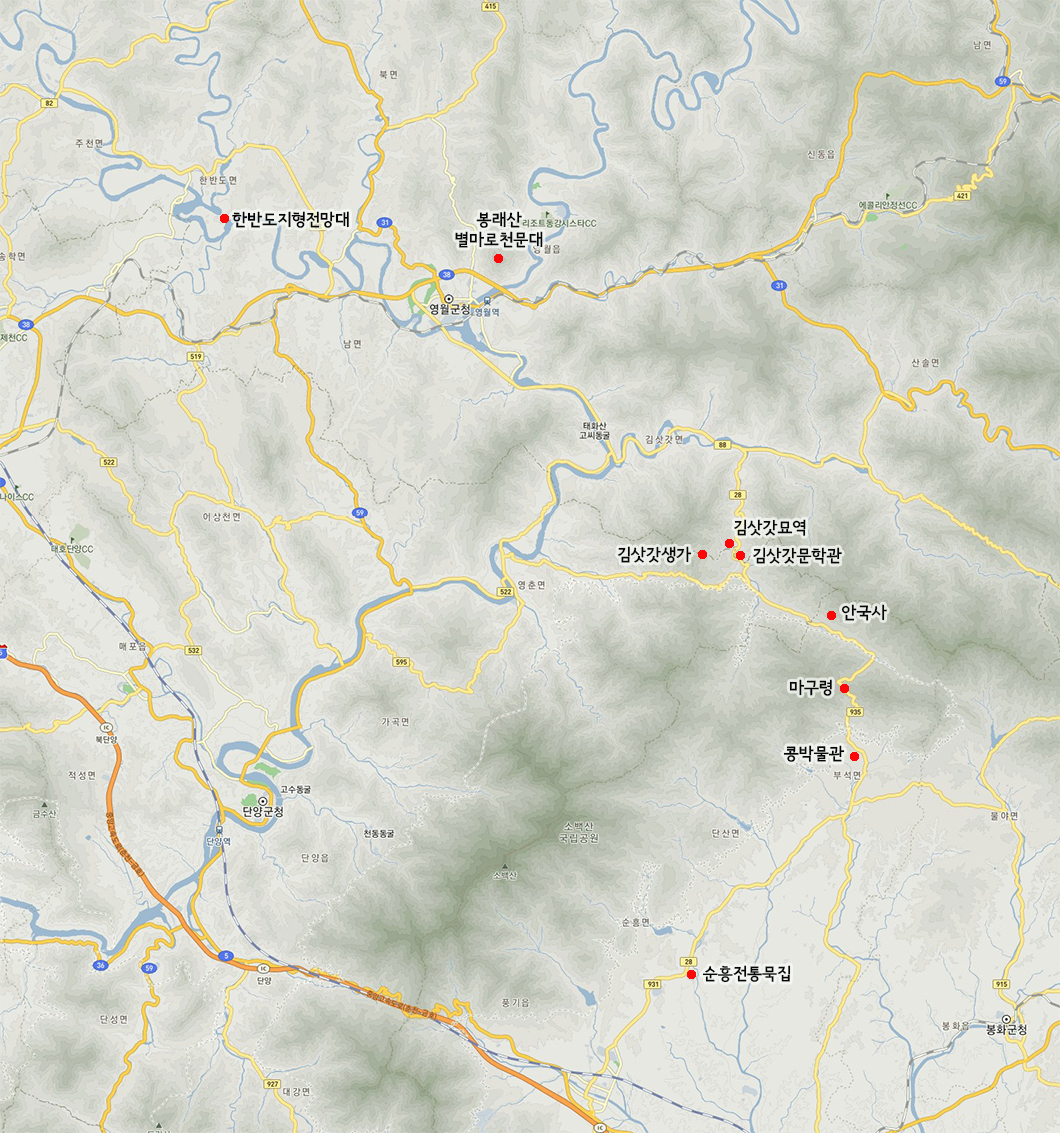 대구 - 중앙고속도로 - 풍기 IC - 순흥전통묵집에서 점심 식사 - 부석면 콩박물관 - 마구령 고개를 넘어서 - 마포천 따라 이동하다가 - 안국사에서 잠시 휴식 - 김삿갓 문학관 - 김삿갓 묘소 - 생가 올라가다가 되돌아 내려와서 - 별마로 천문대에서 1박 - 한반도 지형 전망대 - 대구로..