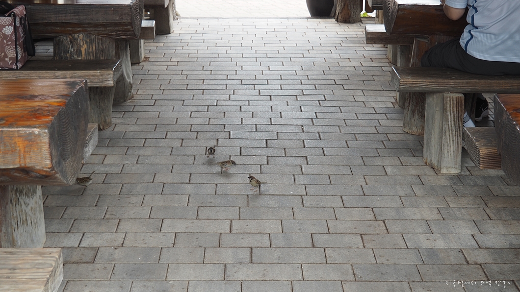 손님들이 흘린 밥알을 주워 먹다가 이제는 일부러 뿌려주는 이들이 있으니 짹짹이들이 그 맛을 들인 듯하네요.