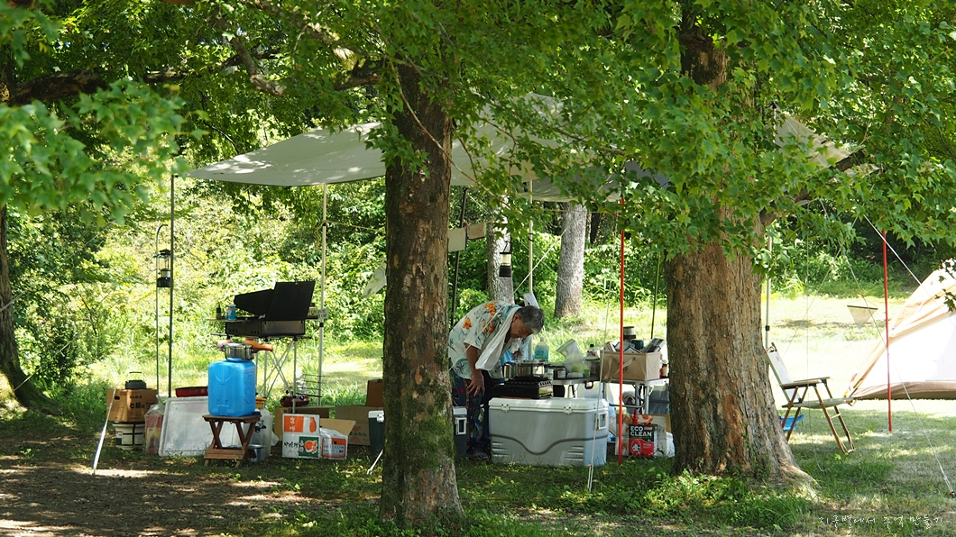 허리도 곧장 펴지 못하는 노부부가 캠핑을 왔는데 집안 살림살이 반 정도는 동원한듯한 모습입니다.