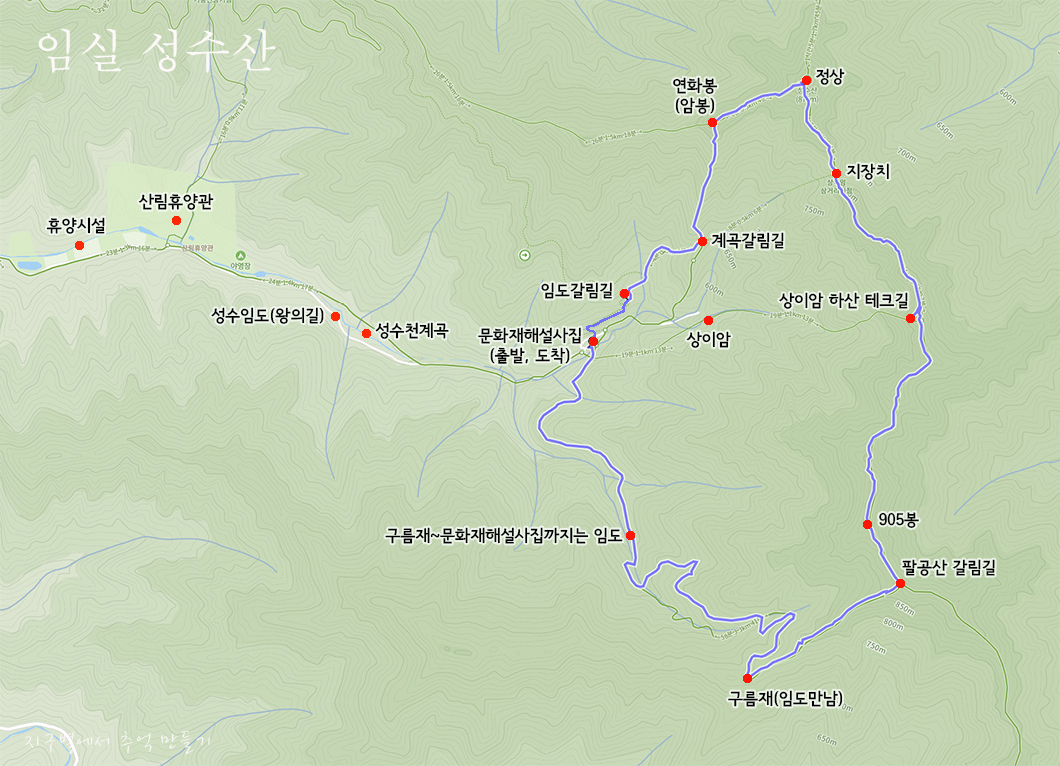 산행 코스 : 상이암 아래 문화해설사의 집 자리에 주차 - 연화봉 - 정상 - 905능선 - 905봉 - 팔공산 갈림길 - 구름재 - 임도 - 해설사집(원점회귀)