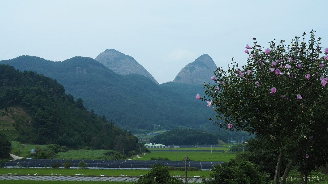 무궁화 예쁘게 핀 가로수길 건너 저편에서 오뚝 솟은 마이산이 내다보고 있습니다.
