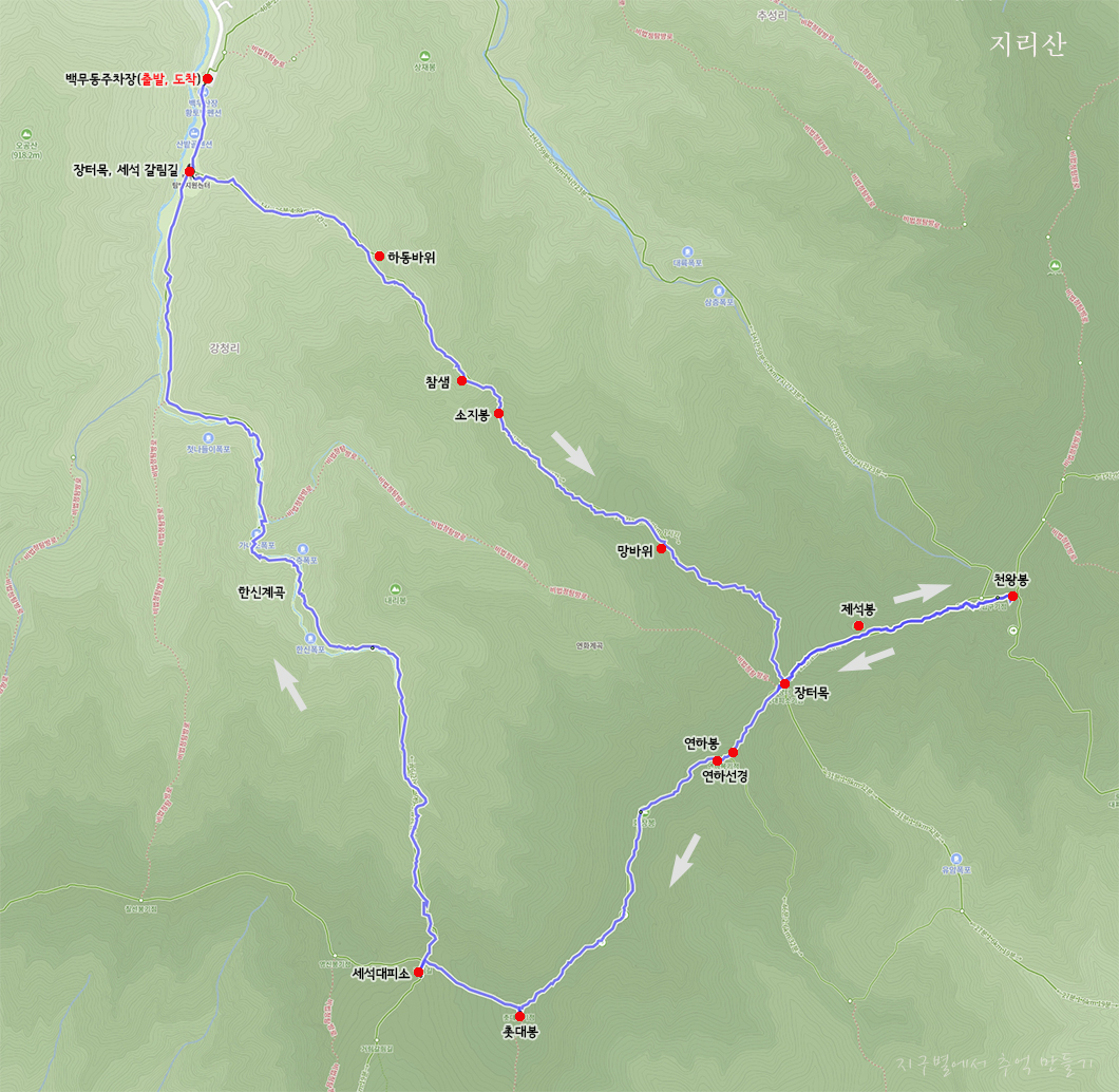 산행 코스 : 백무동 - 장터목 - 천왕봉 - 연하선경 - 세석 - 한산계곡 - 백무동(원점회귀)