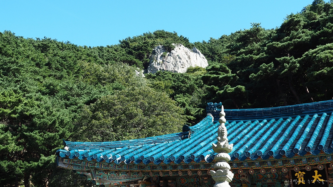 본전 지붕 위로 올려다보이는 도통바위