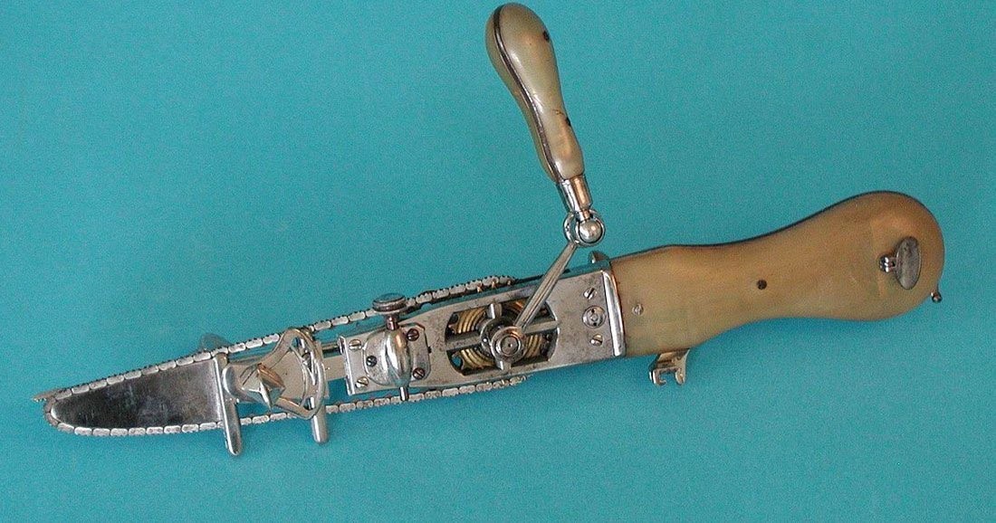 46. 최초의 전기톱은 출산 중에 여성을 돕기 위해 발명되었습니다. 여성이 어려움을 겪고 있으면 의사는 심피시오토미를 시행합니다. 의사는 아래에 있는 작은 전기톱으로 치골을 절단했습니다.