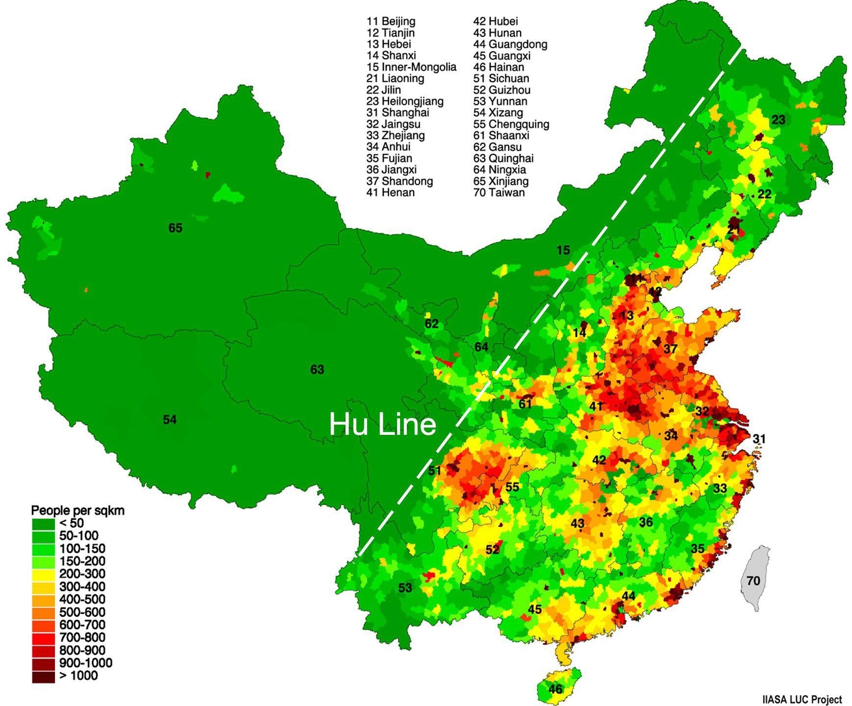41. 중국의 인구밀도. 인구의 94%가 점선 오른쪽(Hu 라인)에 살고 있습니다. 서부 지역은 국토의 57%를 차지하지만 인구는 6%에 불과합니다.