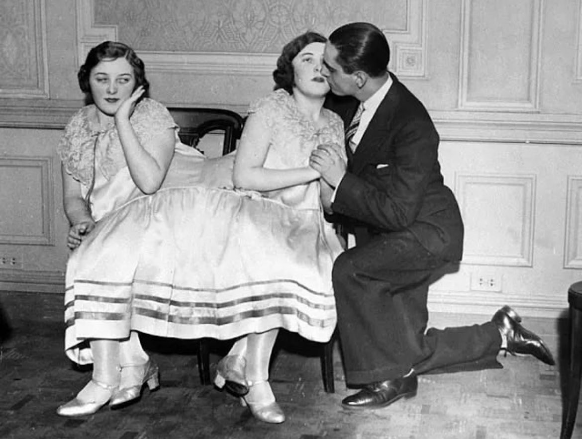 10. 1940년대 사진입니다. 샴쌍둥이 언니 마가렛 깁(Margaret Gibb)과 남자 친구가 키스를 하는 장면을 여동생 메리가 바라보고 있습니다.