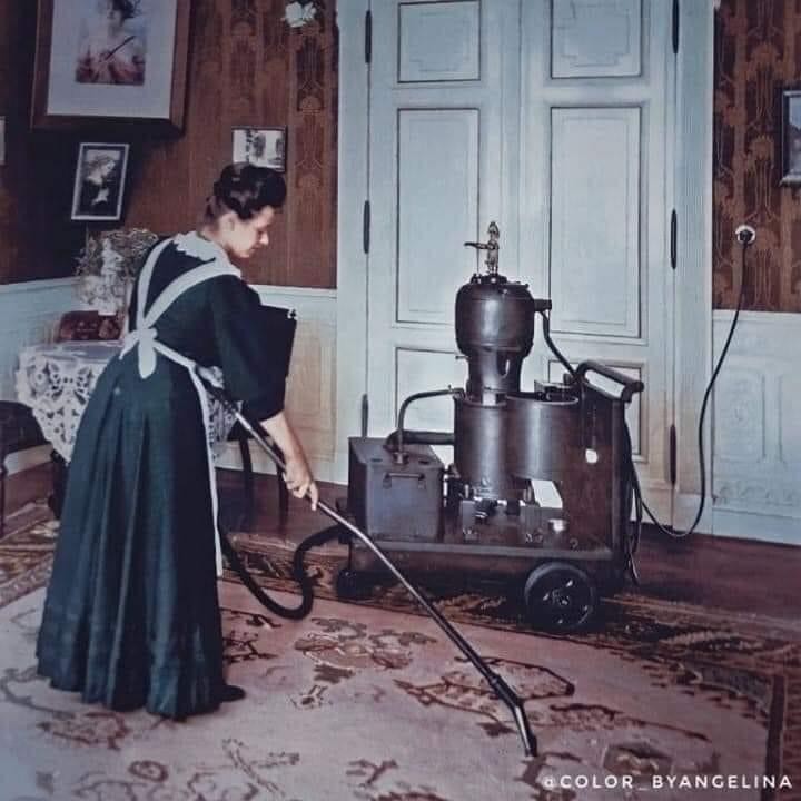 1. 1906년 최초의 가정용 진공청소기로 집을 청소하는 가정부.
