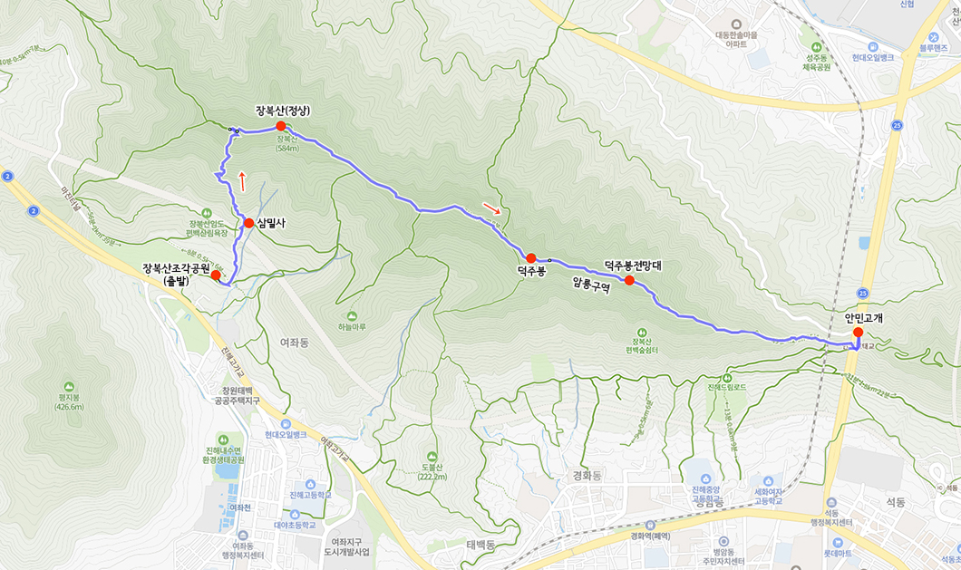 산행 코스 : 장복산조각공원 - 삼밀사 - 편백욕장 - 정상 - 덕주봉 - 안민고개.... (택시로 장복산조각공원)