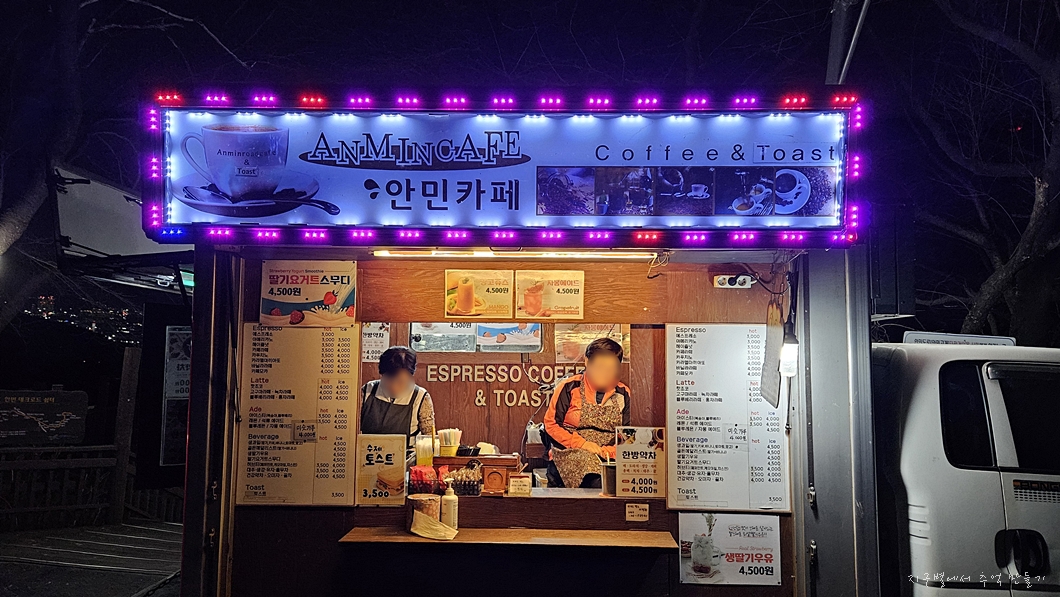 안민 고개의 노점 카페에서 토스트와 커피로 저녁 비슷하게 하면서 택시 호출을 하는데 콜을 하니 모두 취소를 하네요.