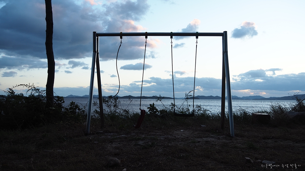 끈이 하나 붙어 있는 그네에 앉아 있으니 저절로 움직이네요.