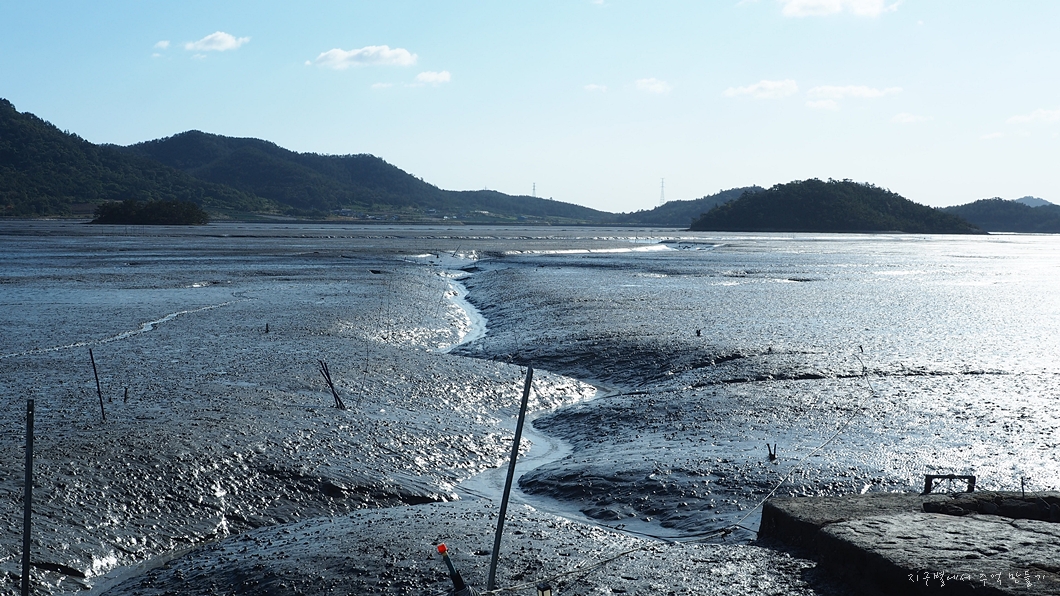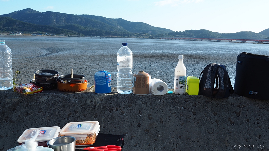 갯벌이 보이는 곳 둑에 앉아서 아침 식사.