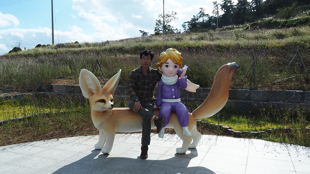 어린왕자와 절친인 여우가 반월에 다정하게 앉아 있습니다.