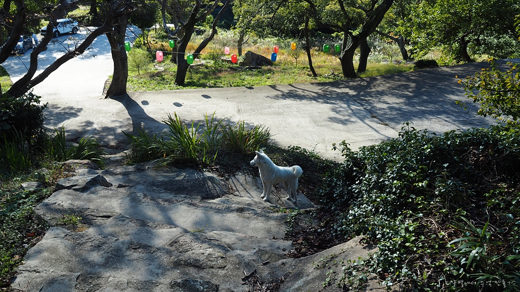 백구보살이 길 가운데서 배웅을 하고 있네요.