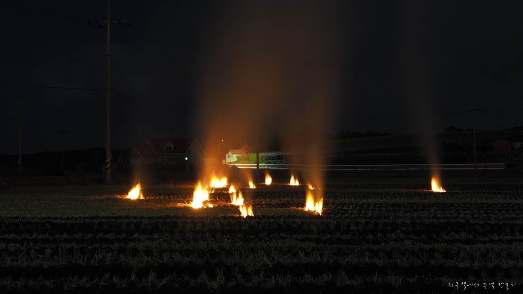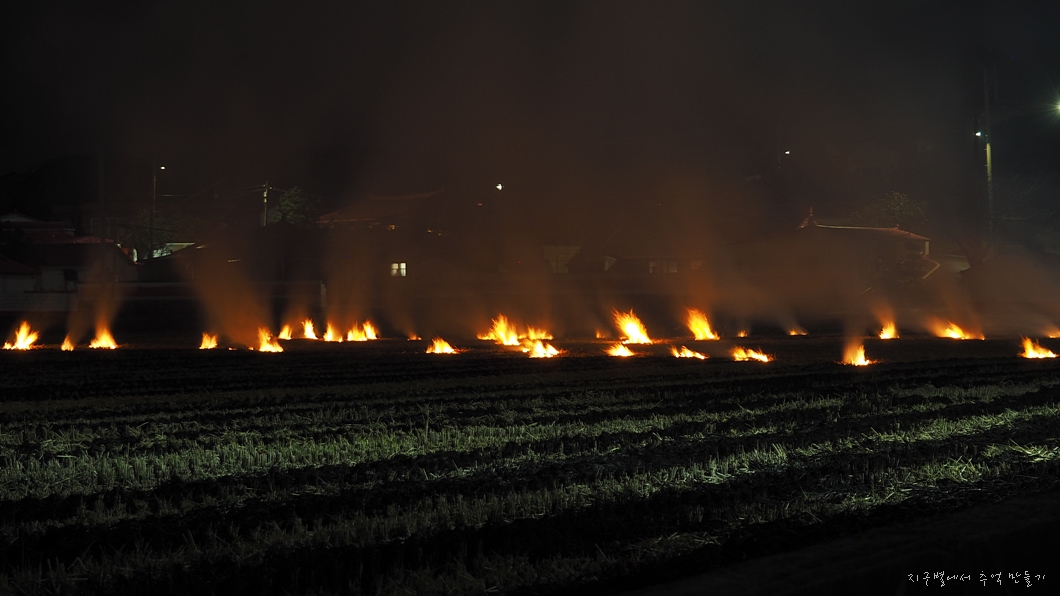 시골에서는 타작이 끝난 논에서는 마무리로 남은 찌꺼기들을 모아서 불을 질러 태우는데 밤에도 들판에 불이 피어 있기도 하였지요.