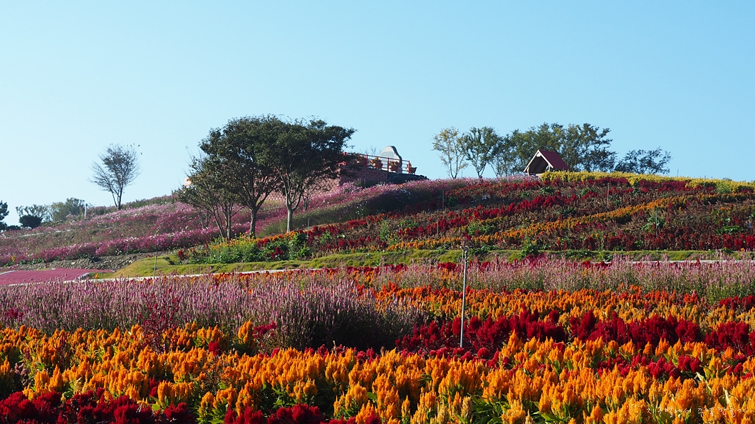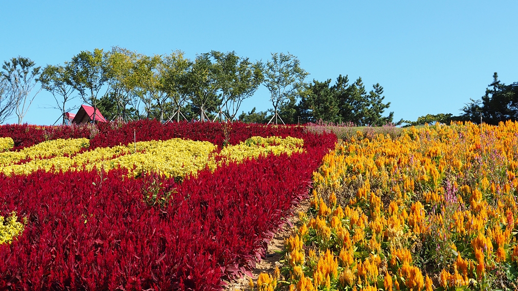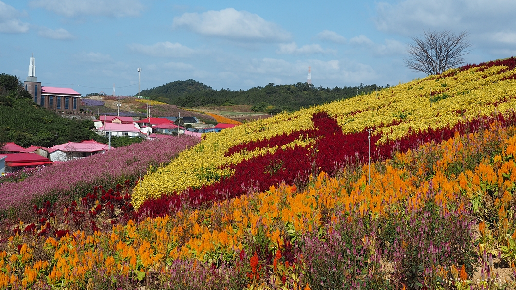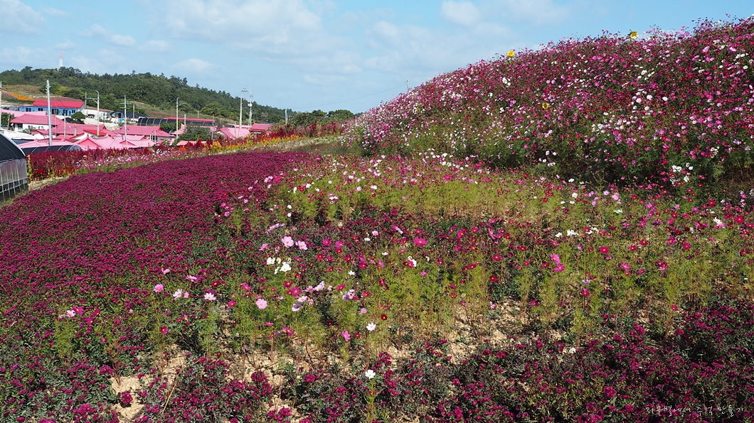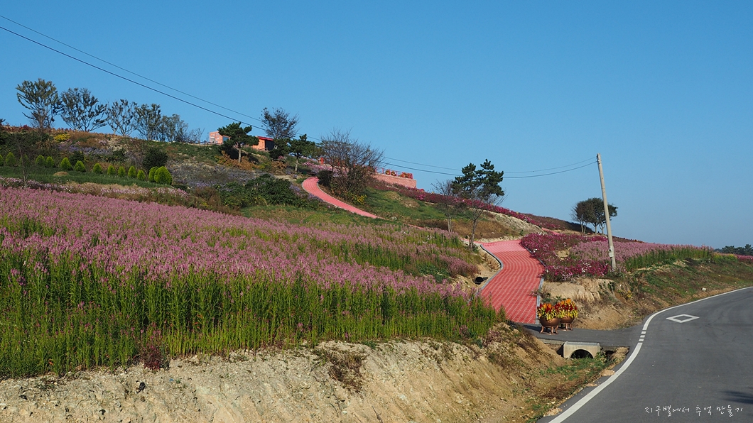 꽃밭이 상당히 크게 조성되어 있고 그 앞에 있는 마을과 기가 막힌 조화가 되네요.