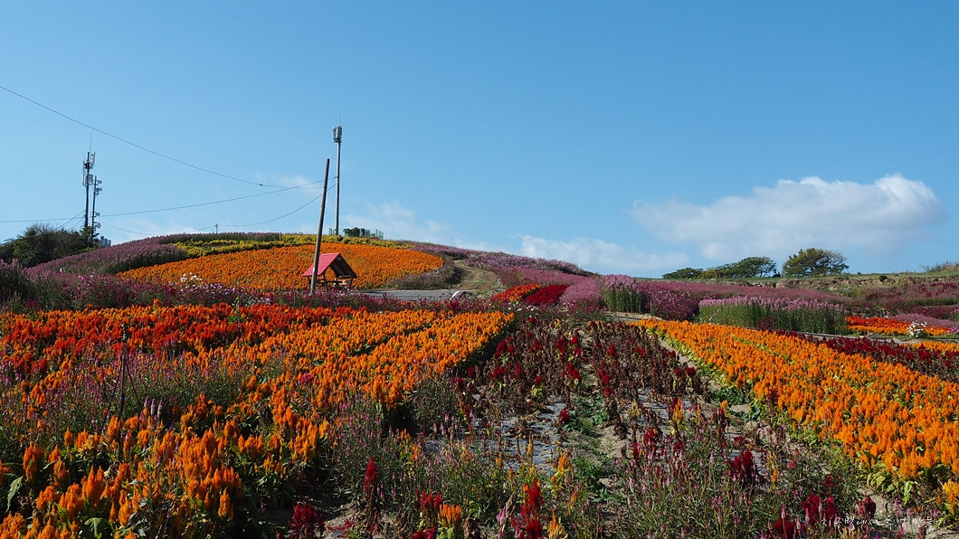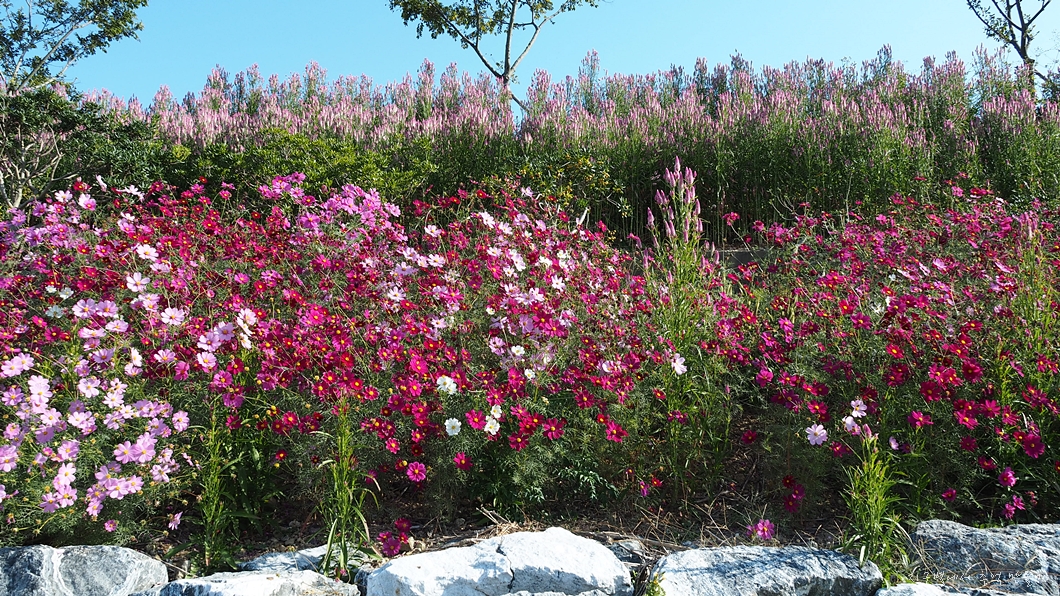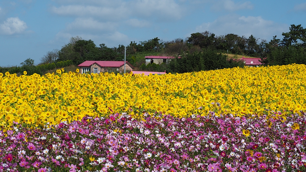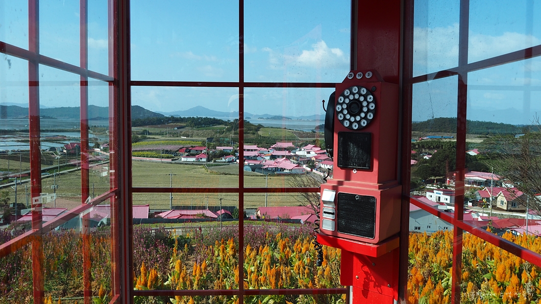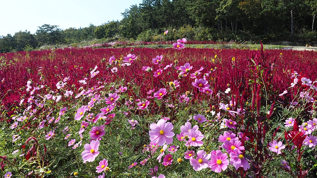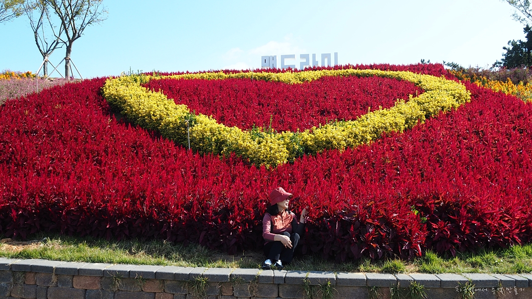 꽃밭이 상당히 크게 조성되어 있고 그 앞에 있는 마을과 기가 막힌 조화가 되네요.