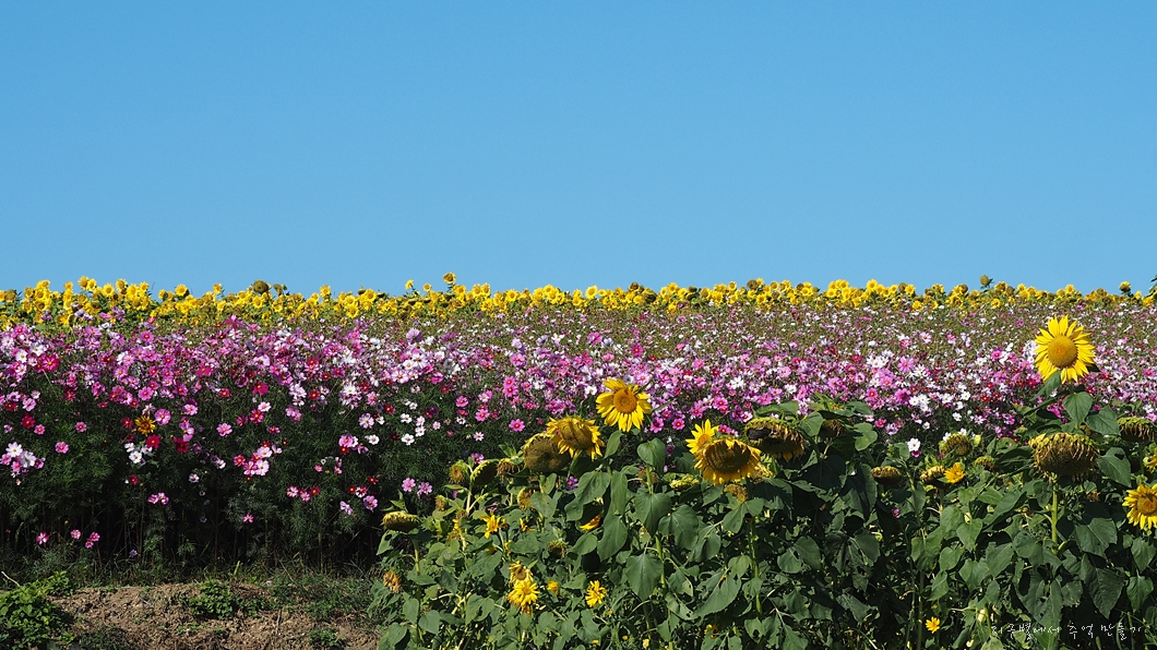 맨드라미, 코스모스, 해바라기가 그렇게 서로 잘 어우러지는 풍경은 처음 봤네요.