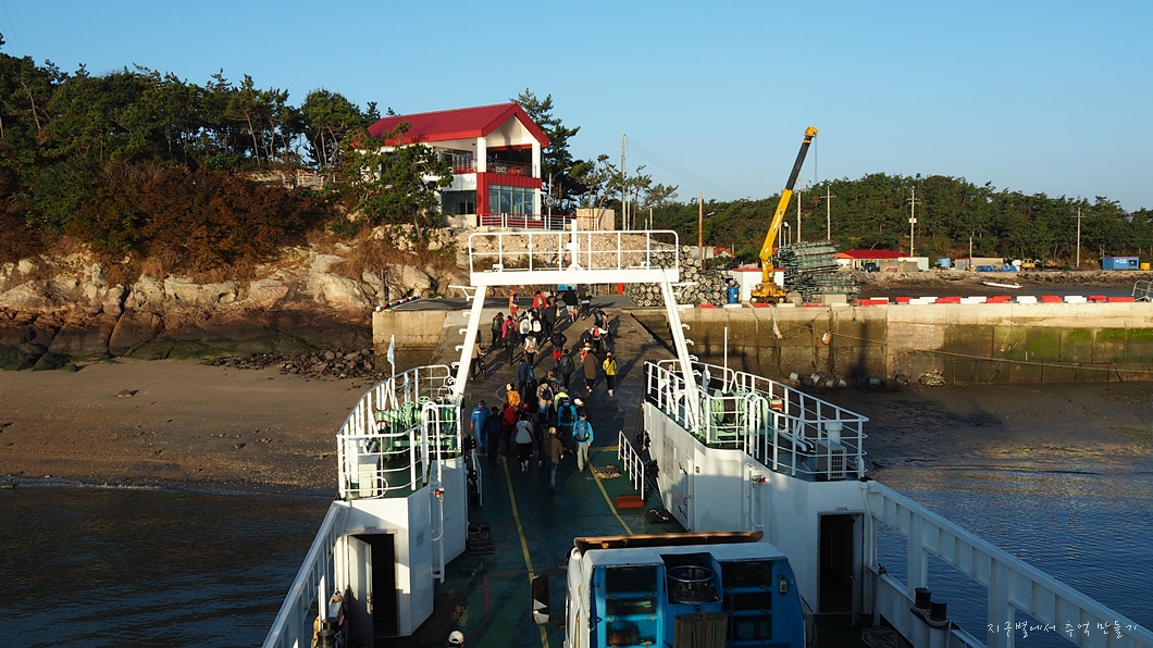 우리는 대기점선착장 표를 구해서 타고 왔기 때문에 이곳에서 내릴 생각이 전혀 없이 배 위에서 내리는 여행객들 구경하고 있었는데 선장이 달려와서 양해를 구한다면 대기점항에 물이 빠져 차를 하선할 수 없다고 하면서 이곳에서 내리라고 합니다.