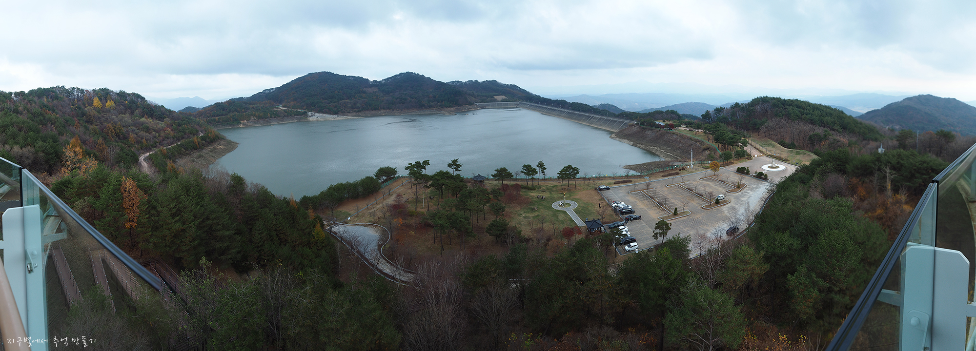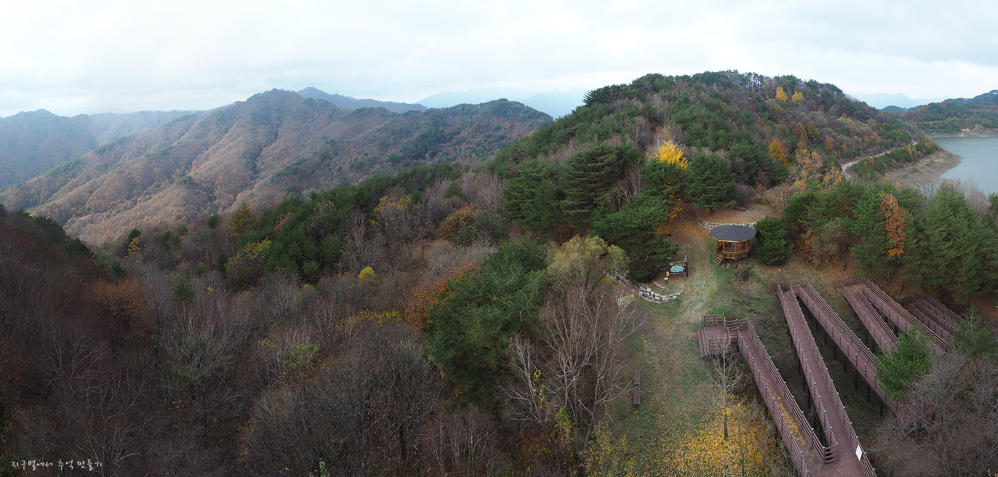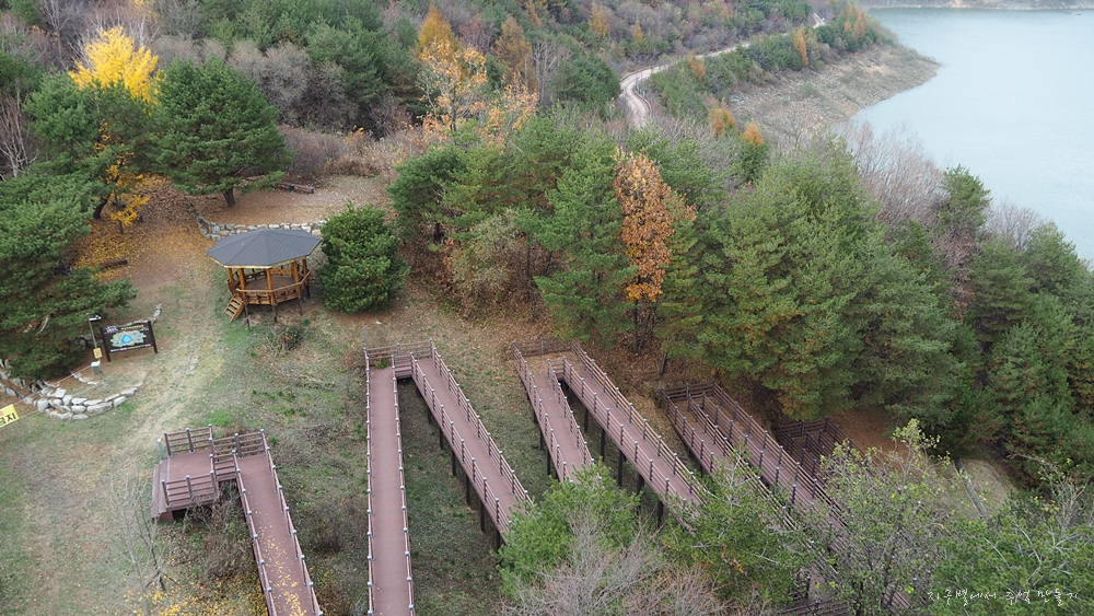 저수지에서 전망대로 오르는 데크길이 내려다 보입니다.