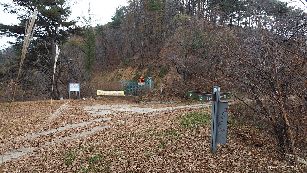 이곳에서 느낌상 분명 저곳 앞쪽의 출입금지 휀스를 지나가야 되는데 산사태로 위험하다는 안내문과 함께 출입금지가 되어 있어 우측 임도를 따라 내려갑니다.