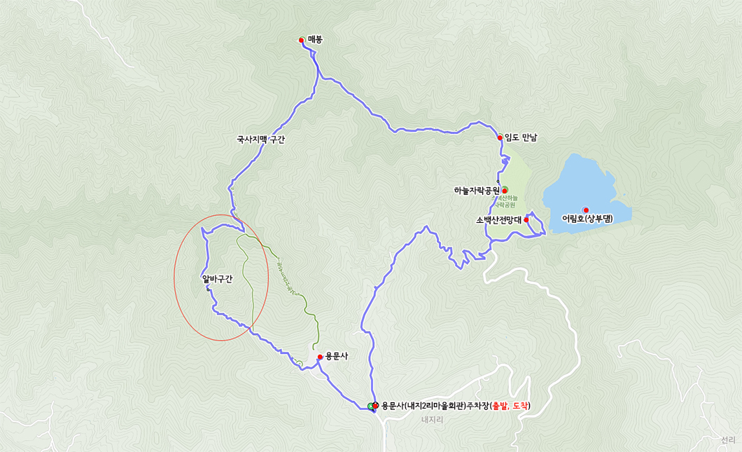 산행 코스 : 내지마을 주차장 - 용문사 - 매봉 - 하늘자락공원 - 어림호 - 소백산전망대 - 주차장(원점회귀)