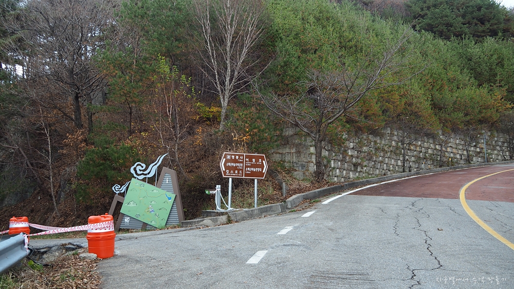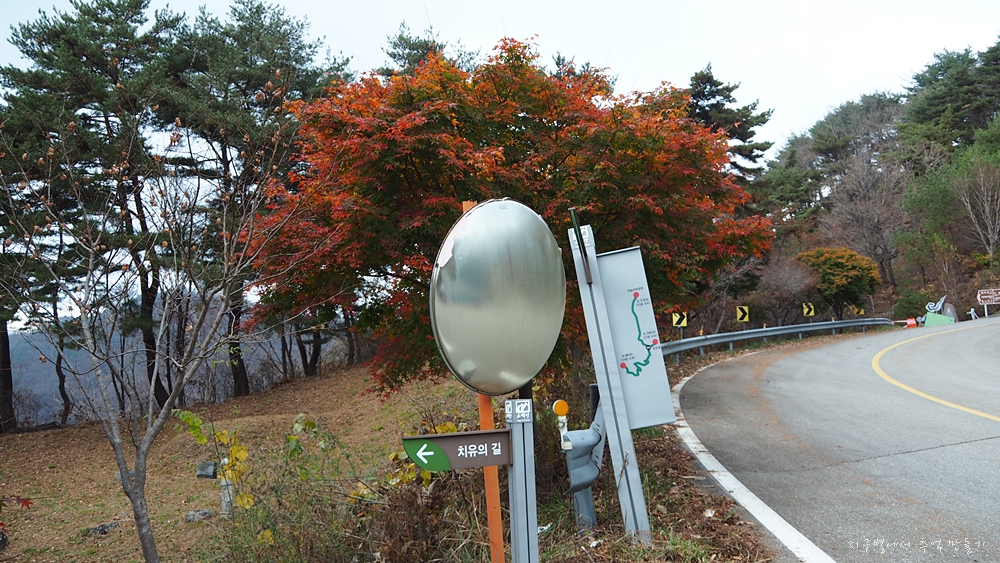 어림호에서 내려와 포장도로길을 따르다가 곧 치유의 길로 하산합니다.
