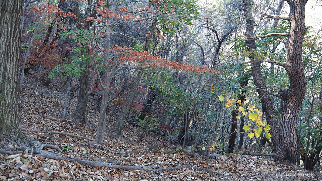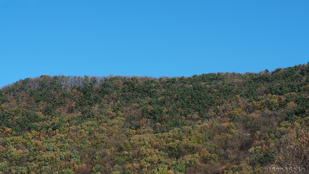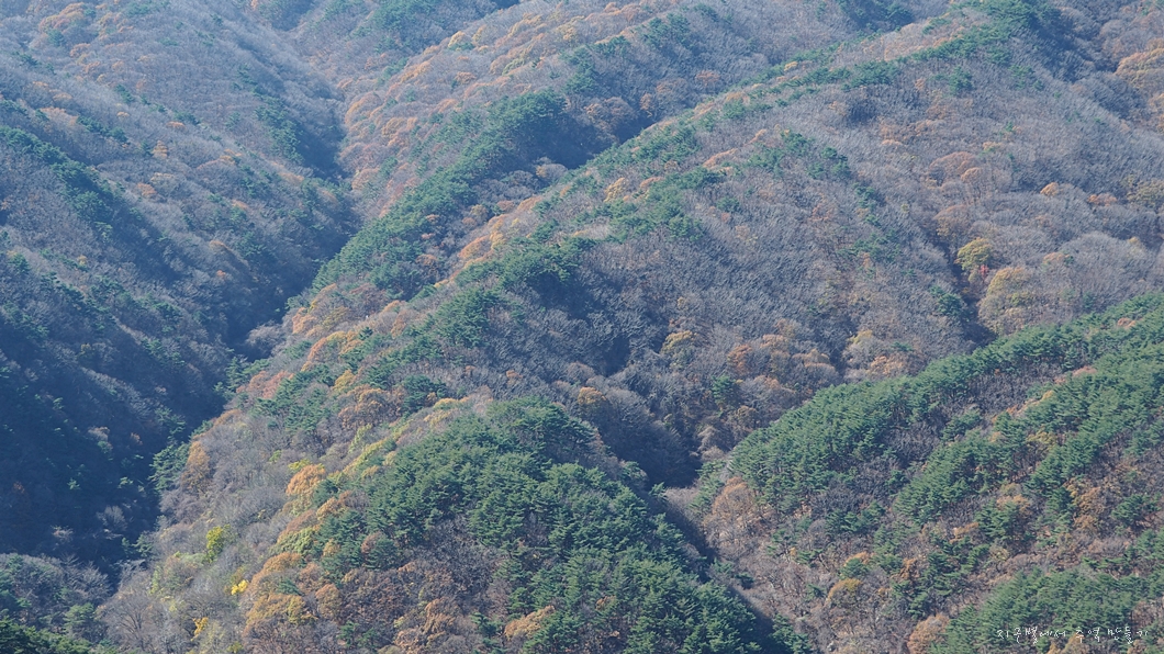 참나무가 가을에는 골드빛으로 가장 가을 분위기를 돋우는데 떨어진 낙엽은 등산로에 수북하여 걷기 정말 불편하지유.