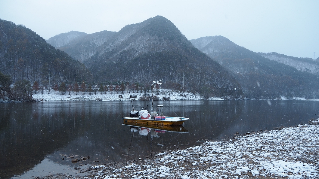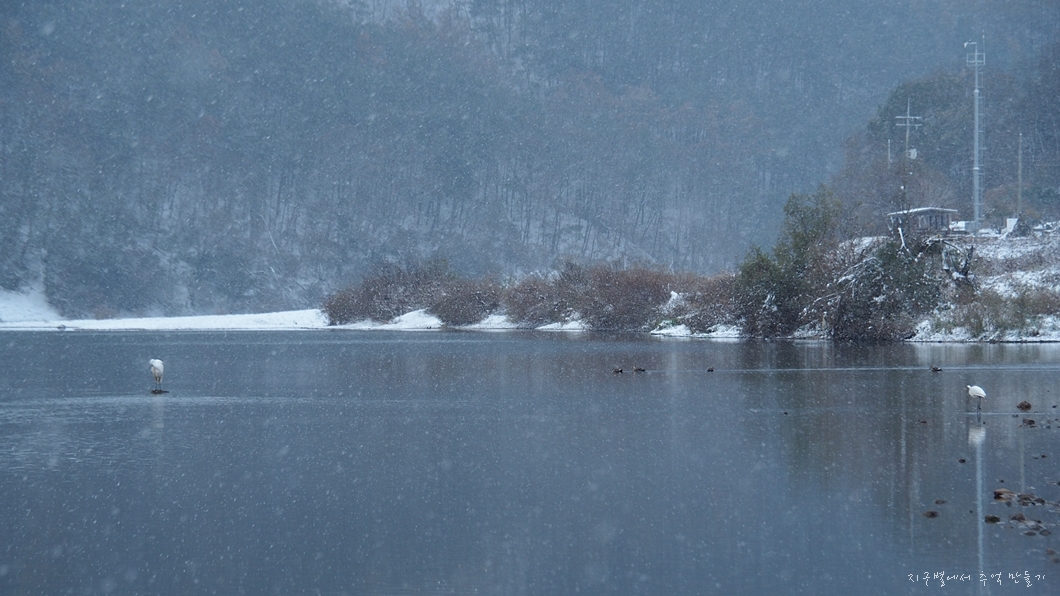 눈이 펑펑 내리는 강에서 백로는 깃털을 움추리고 먹이를 찾고 있네요.