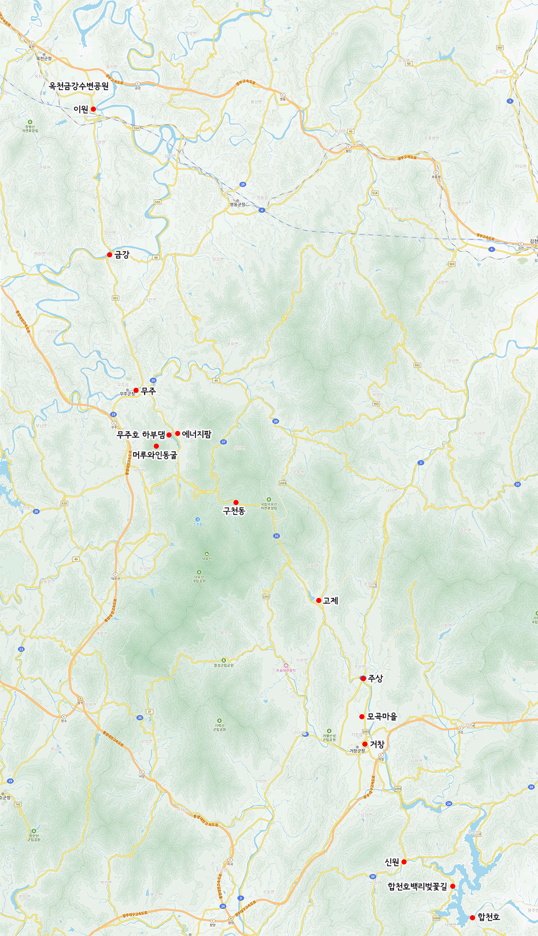 처음 계획은 용담호에서 출발하여 금강변 도로를 따라 오르는 계획이었는데 시골에서 한나절 보내는 바람에 합천호에서 오후 출발하여 금강휴게소까지는 네비에서 '가장 가까운 길(가장 시골스러운 길)'을 선택하여 그야말로 세월아 하면서 천천히 올랐네요.