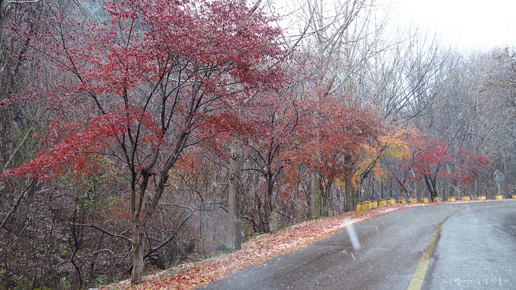 눈이 내린 산과 가까이 있는 단풍을 같이 보면서 산을 내려 옵니다.