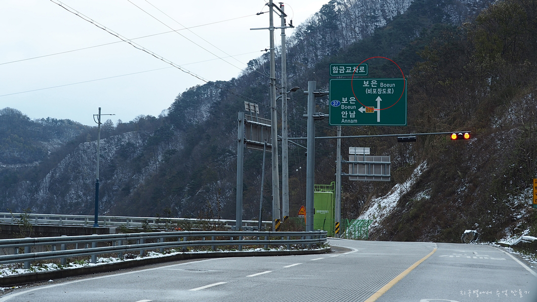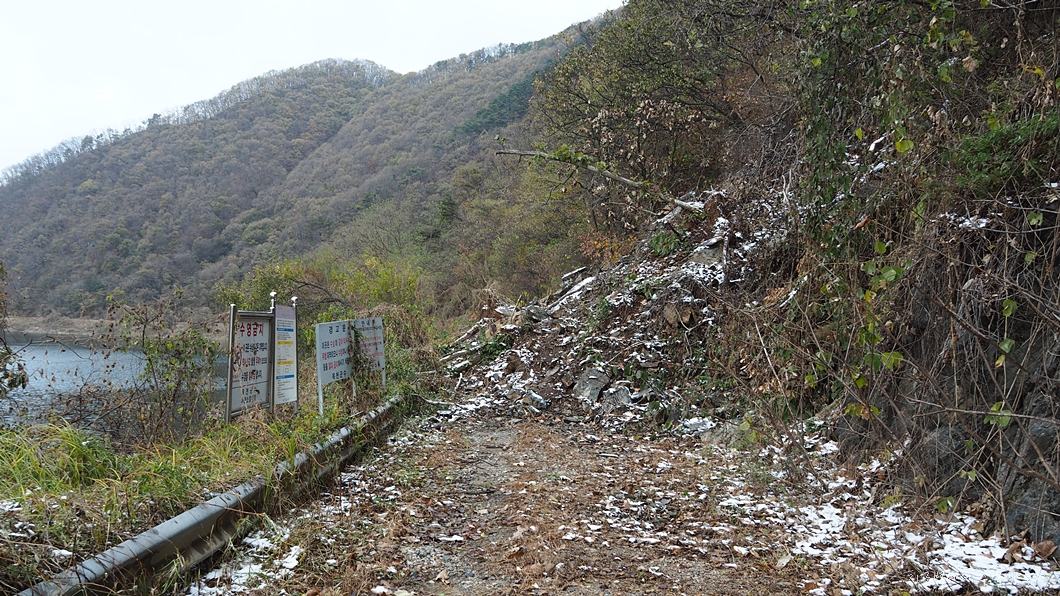위 지도 중 석호리라고 되어 있는 곳에서 산길 임도를 넘어가는데 전날 내린 눈으로 임도가 엉망진창.